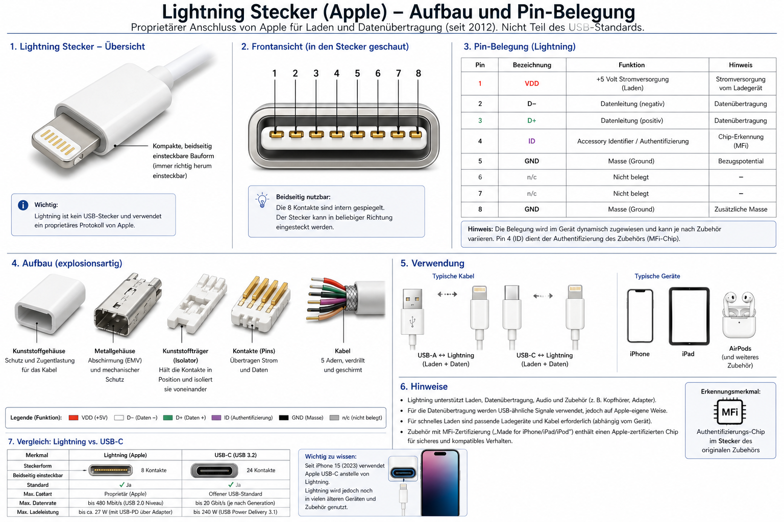 Lightning ist kein USB-Stecker im eigentlichen Sinne, wird im Alltag aber fast immer zusammen mit USB genannt. Der Grund ist einfach: Lightning wird vor allem zum Laden und zur Datenübertragung genutzt – also genau für die gleichen Aufgaben wie USB. Der Unterschied liegt darin, dass Lightning ein proprietärer Anschluss von Apple Inc. ist und nicht Teil des USB-Standards.