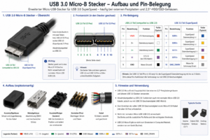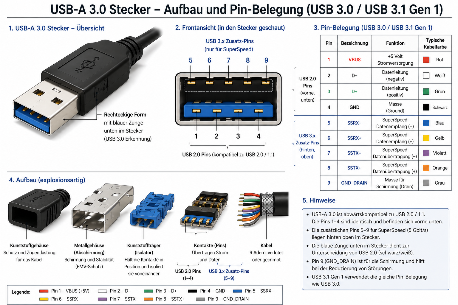 Datenraten bis 5 Gbit/s. Neue Pins und oft blaue Anschlüsse zur Unterscheidung von USB 2.0.