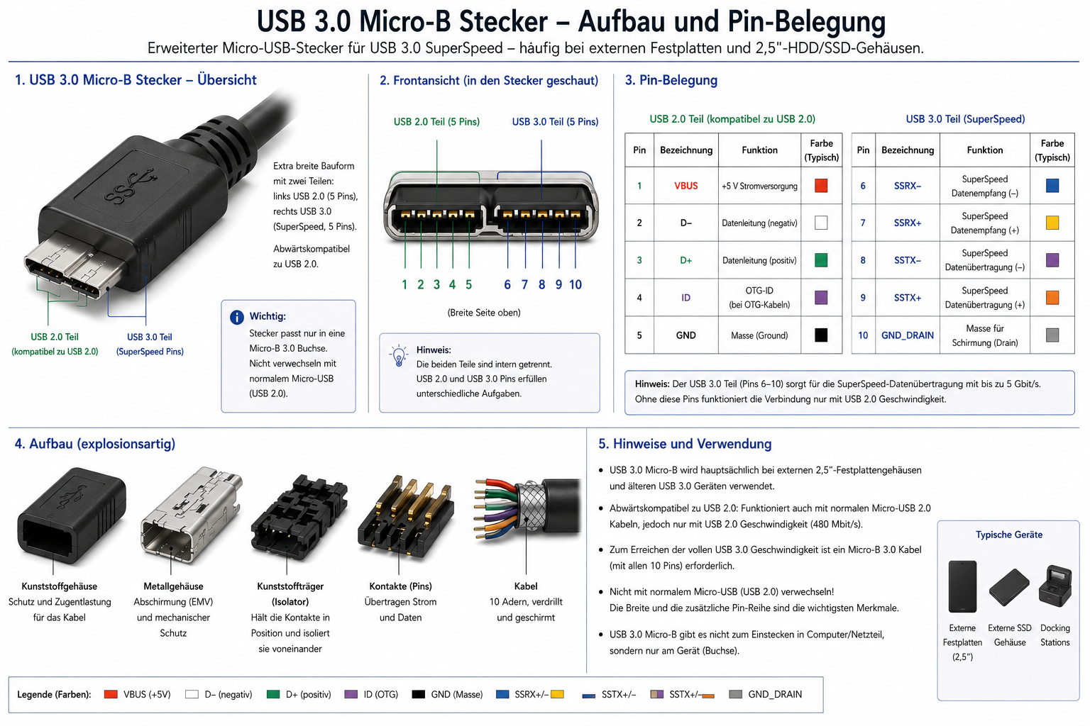 USB 3.0 Micro-B ist damit ein typisches Beispiel für eine Übergangslösung. Er wurde entwickelt, um höhere Geschwindigkeiten in eine bestehende Steckerfamilie zu integrieren. Technisch sinnvoll, aber optisch und praktisch nicht ideal. Genau deshalb wurde er später durch bessere und einfachere Lösungen ersetzt.