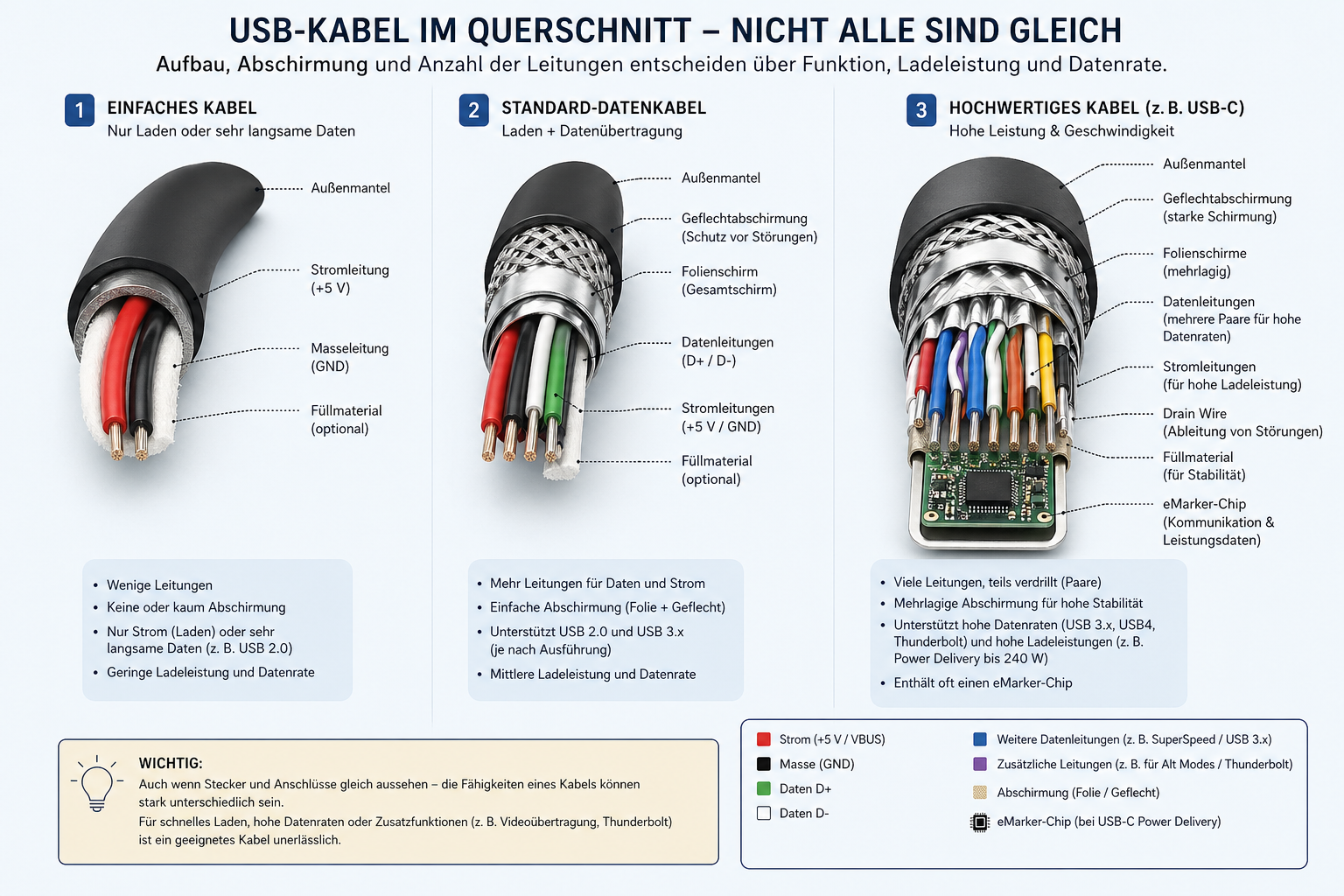 Gerade bei USB-C wird das besonders deutlich. Hier gibt es Kabel, die nur für einfache Anwendungen gedacht sind, und solche, die deutlich mehr leisten können. Ein hochwertiges Kabel kann hohe Ladeleistungen übertragen und gleichzeitig schnelle Datenraten ermöglichen. Ein einfaches Kabel sieht vielleicht genauso aus, ist aber intern deutlich einfacher aufgebaut und stößt schneller an seine Grenzen.