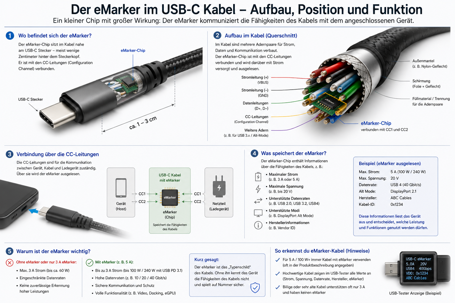 Der eMarker, kurz für „Electronically Marked Cable“, ist im Grunde eine Art Informationsspeicher im Kabel. Er enthält Angaben darüber, welche Fähigkeiten das Kabel besitzt. Dazu gehören unter anderem die maximale Stromstärke, die unterstützte Spannung, mögliche Datenraten und zusätzliche Funktionen. Man kann sich den eMarker wie einen kleinen Ausweis vorstellen, der dem angeschlossenen Gerät mitteilt, wozu das Kabel in der Lage ist.